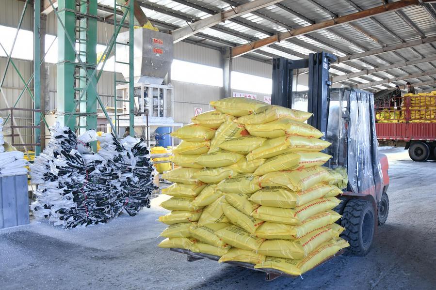Workers transport mixed fertilizers at a farming company under Beidahuang Group in northeast China's Heilongjiang Province, March 17, 2026. (Photo by Qian Boyu/Xinhua)