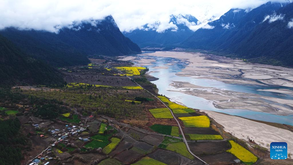 A drone photo taken on March 20, 2026 shows fields of rapeseed flowers in Bomi County of Nyingchi City, southwest China's Xizang Autonomous Region. Rapeseed flowers and peach flowers here are in full bloom, creating a picturesque scene on the plateau. (Xinhua/Purbu Tsering)