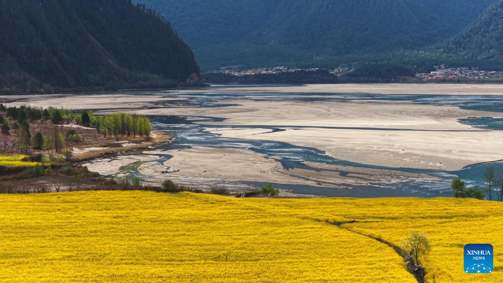 A drone photo taken on March 20, 2026 shows a field of rapeseed flowers in Bomi County of Nyingchi City, southwest China's Xizang Autonomous Region. Rapeseed flowers and peach flowers here are in full bloom, creating a picturesque scene on the plateau. (Xinhua/Purbu Tsering)