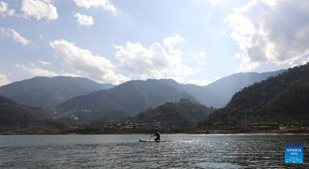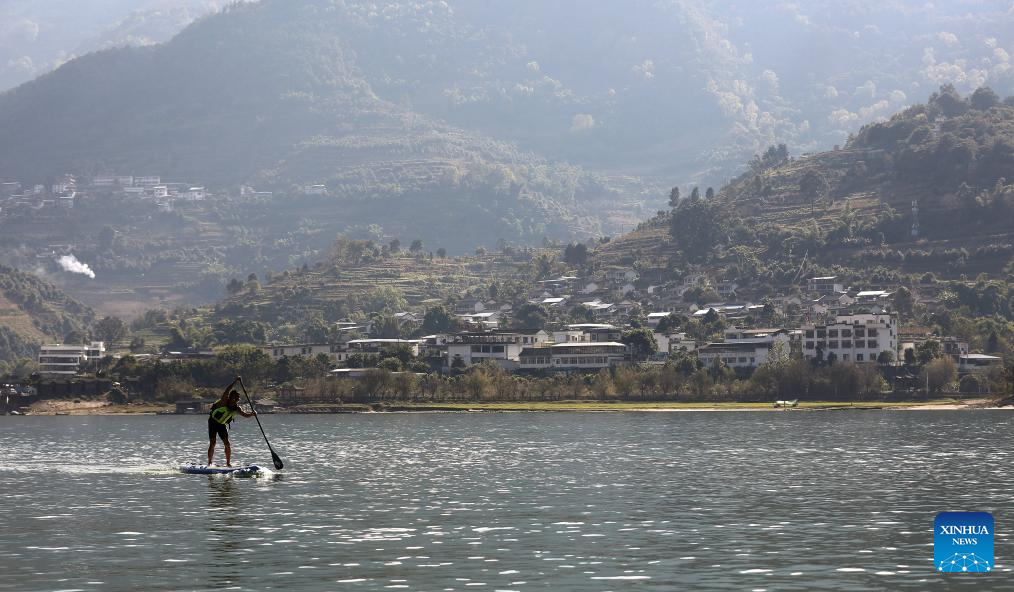 A man enjoys paddle boarding at a water sports base on the Lancang River in Gonglang Town in Nanjian Yi Autonomous County, southwest China's Yunnan Province, Dec. 25, 2025. In recent years, Gonglang Town, boasting an advantageous ecological environment and pleasant climate throughout the year, has actively revitalized the rural economy by developing water sports initiatives and promoting cultural tourism.