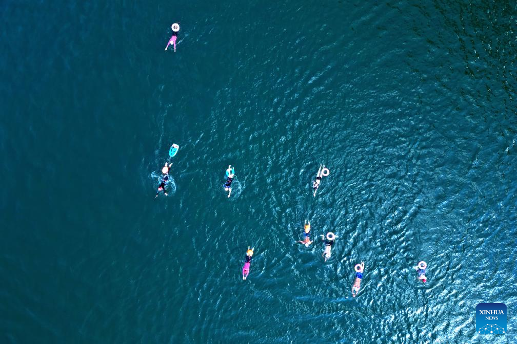 An aerial drone photo taken on Dec. 25, 2025 shows people swimming in the Lancang River in Gonglang Town in Nanjian Yi Autonomous County, southwest China's Yunnan Province. In recent years, Gonglang Town, boasting an advantageous ecological environment and pleasant climate throughout the year, has actively revitalized the rural economy by developing water sports initiatives and promoting cultural tourism.