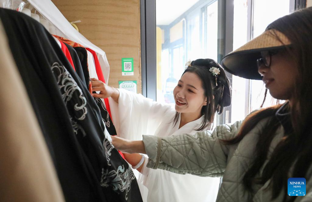 Tourists choose costumes at a traditional Chinese-style photography studio in Gonglang Town in Nanjian Yi Autonomous County, southwest China's Yunnan Province, Dec. 25, 2025. In recent years, Gonglang Town, boasting an advantageous ecological environment and pleasant climate throughout the year, has actively revitalized the rural economy by developing water sports initiatives and promoting cultural tourism.