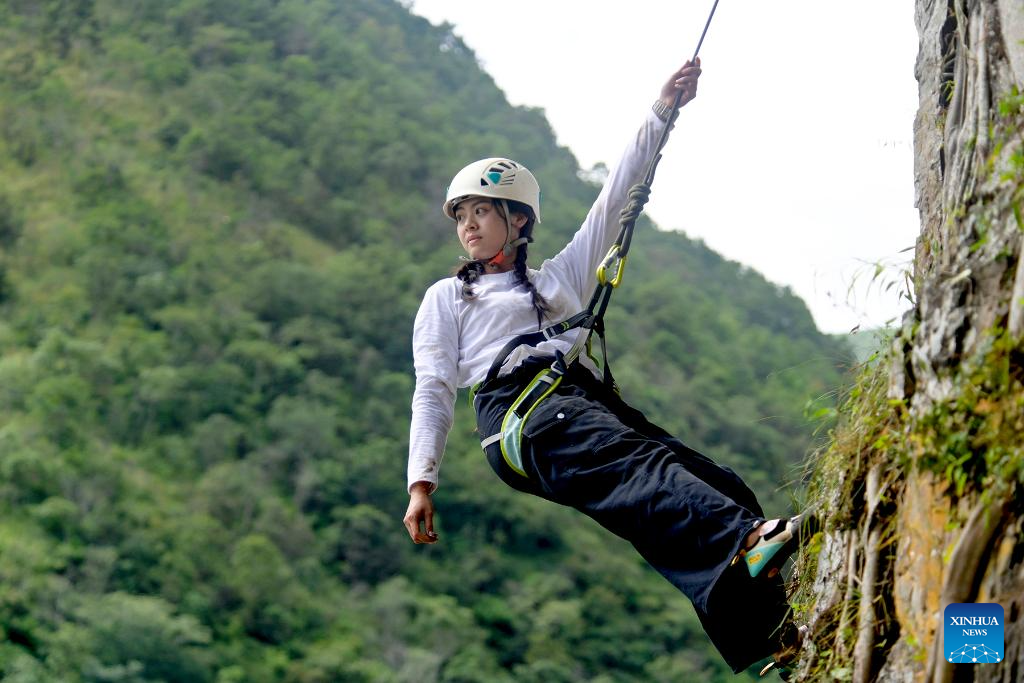 A tourist tries cliff climbing at a water sports base on the Lancang River in Gonglang Town in Nanjian Yi Autonomous County, southwest China's Yunnan Province, July 27, 2025. In recent years, Gonglang Town, boasting an advantageous ecological environment and pleasant climate throughout the year, has actively revitalized the rural economy by developing water sports initiatives and promoting cultural tourism.