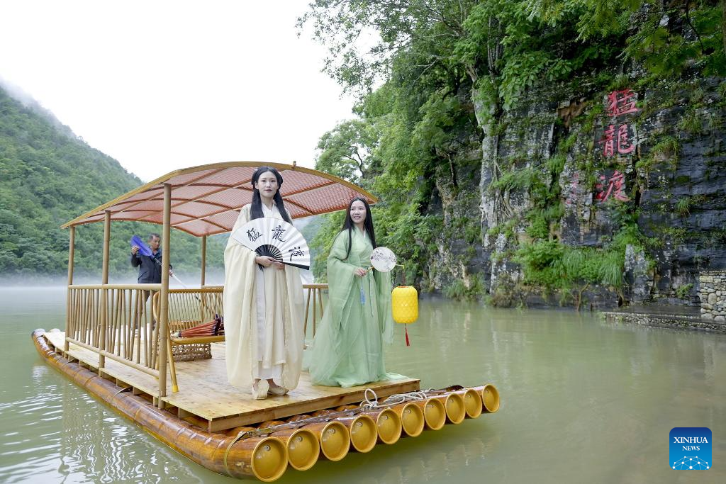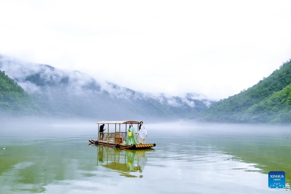 Tourists in traditional Chinese-style costumes pose for travel photos while visiting the Lancang River in Gonglang Town in Nanjian Yi Autonomous County, southwest China's Yunnan Province, July 27, 2025. In recent years, Gonglang Town, boasting an advantageous ecological environment and pleasant climate throughout the year, has actively revitalized the rural economy by developing water sports initiatives and promoting cultural tourism.