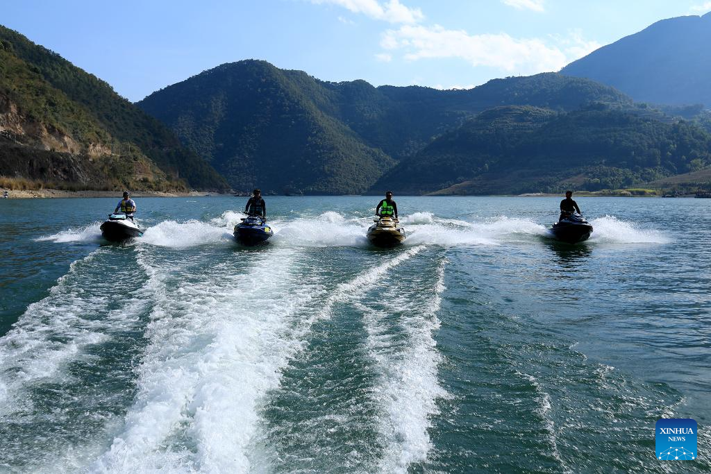People ride jet skis at a water sports base on the Lancang River in Gonglang Town in Nanjian Yi Autonomous County, southwest China's Yunnan Province, Dec. 25, 2025. In recent years, Gonglang Town, boasting an advantageous ecological environment and pleasant climate throughout the year, has actively revitalized the rural economy by developing water sports initiatives and promoting cultural tourism.