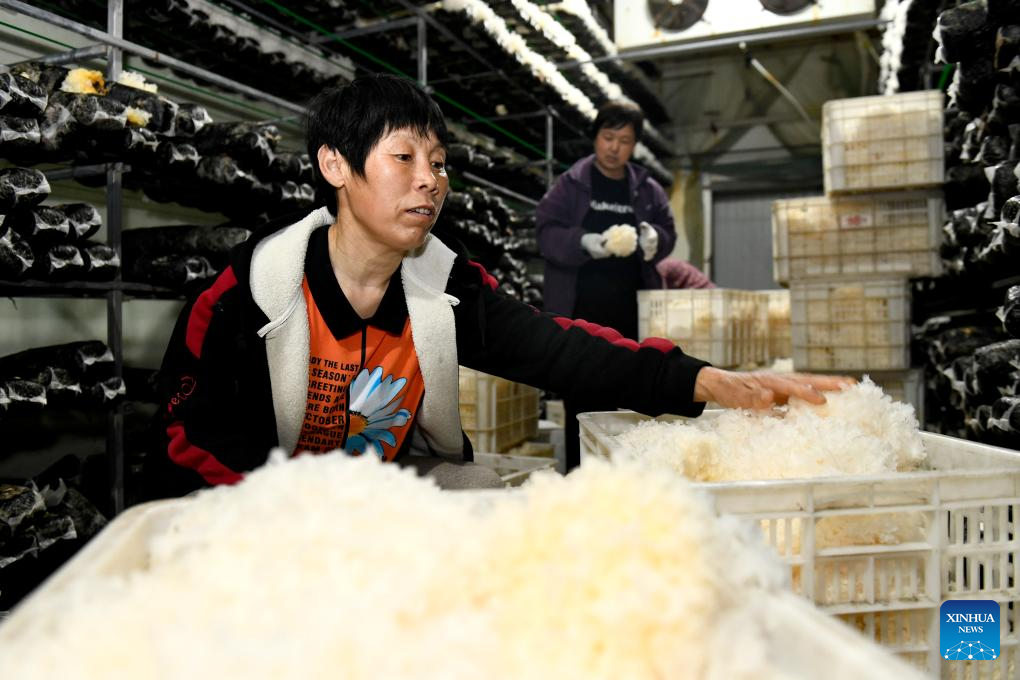 Mushroom farmers sort mushrooms in Huimin County, east China's Shandong Province, April 22, 2026. In recent years, Huimin County has gradually developed the mushroom industry into a distinctive sector that empowers rural revitalization. (Xinhua/Guo Xulei)