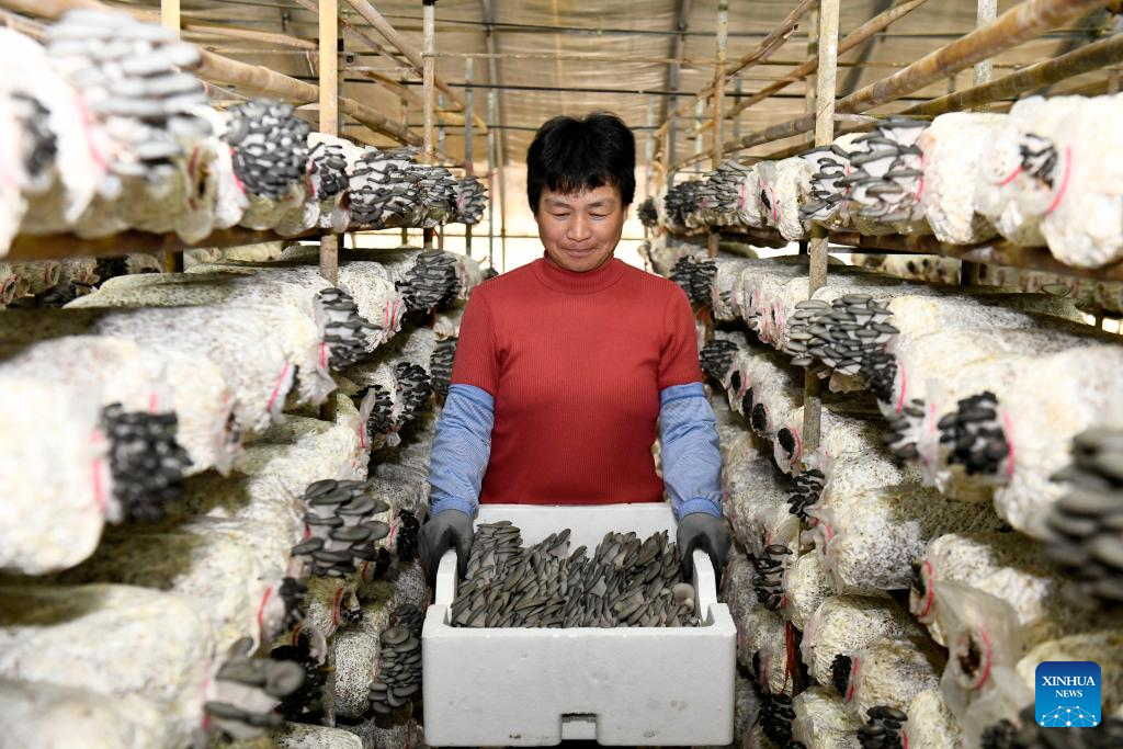A mushroom farmer carries mushrooms in Huimin County, east China's Shandong Province, April 22, 2026. In recent years, Huimin County has gradually developed the mushroom industry into a distinctive sector that empowers rural revitalization. (Xinhua/Guo Xulei)