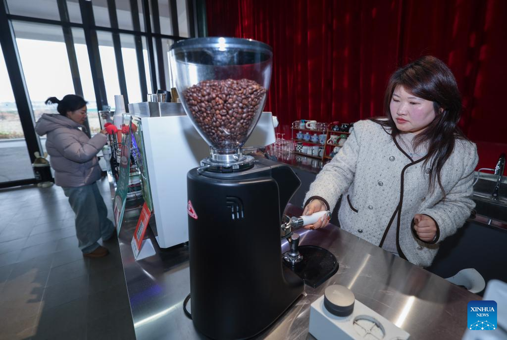 A staff member makes coffee at a cafe in the agricultural service center in Xucang Village of Lyushan Township, Changxing County of east China's Zhejiang Province, on Jan. 6, 2026. In recent years, Lyushan Township has pursued endeavors to promote comprehensive rural revitalization, implementing measures such as establishing agricultural service centers, advancing the consolidation of farmland for large-scale farming, and improving rural living environment. (Xinhua/Xu Yu)